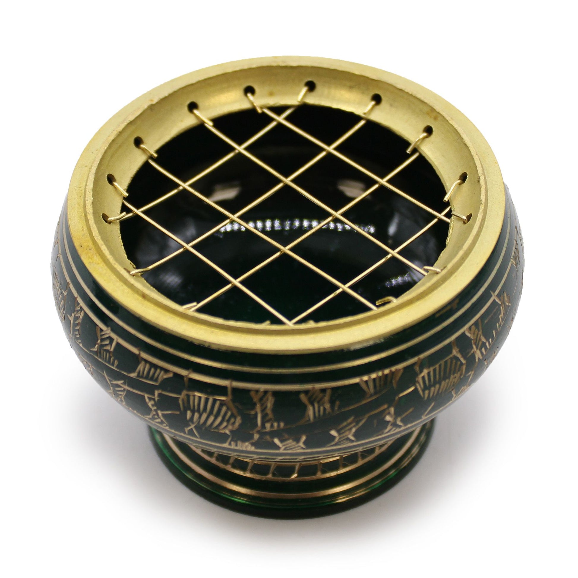 Charcoal Incense Jar in beautiful green colour, with a slightly higher base. Decorated with golden patterns, handmade in India. This incense jar can be used during rituals for purification or activation of the Heart chakra.Â